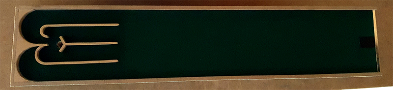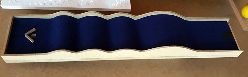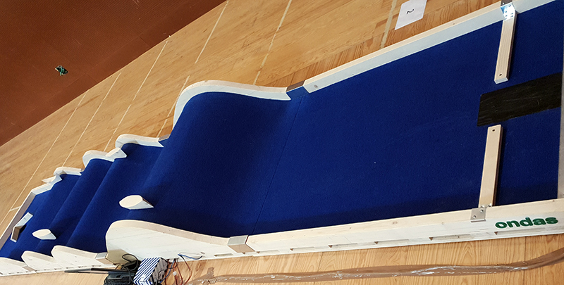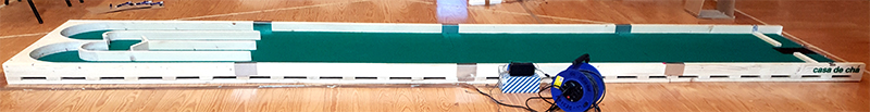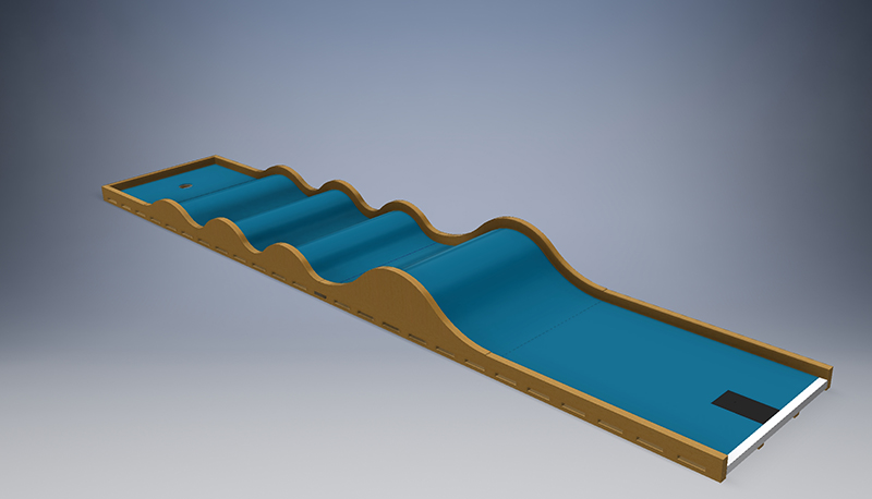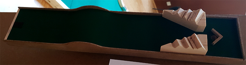 Es ist eine Strecke mit einem geraden und welligen Kurs, fünf Meter lang. Es hat vier wellenförmige Erhebungen: der erste ist fünfunddreißig Zentimeter hoch, die nächsten zwei sind zwanzig Zentimeter lang und die letzten sechs Zoll hoch. In jeder Welle, und in der Nähe der Seiten, ist ein kleines Boot aus Holz platziert.
