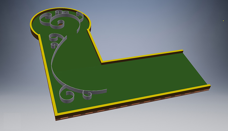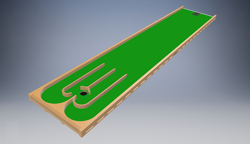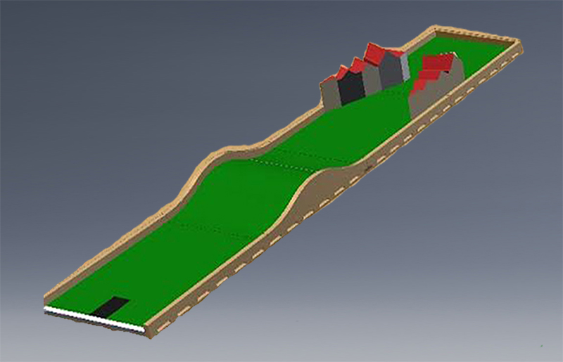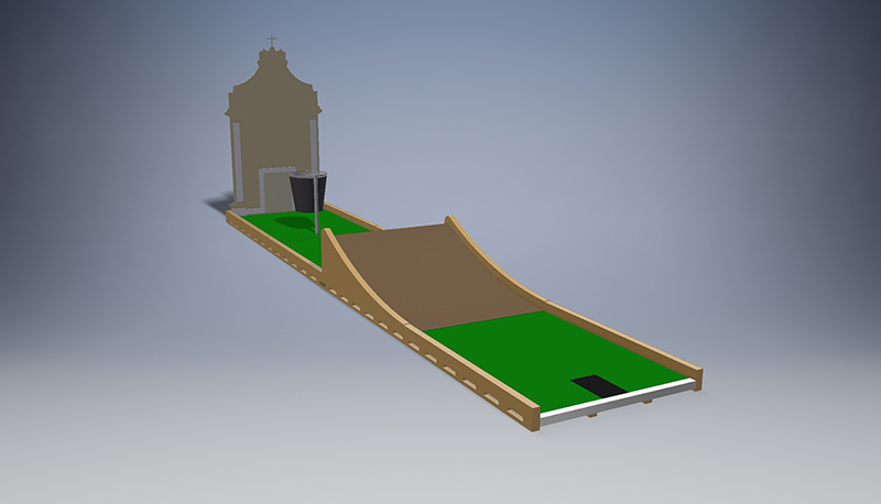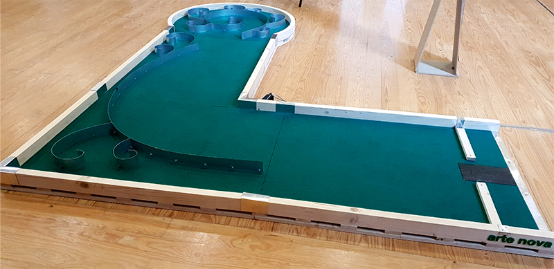 Es ist eine Spur mit einem geraden Kurs mit Misco Meter lang. Es gibt vier Innings, aber nur drei von ihnen weichen dem Ball aus, um ins Loch zu kommen, weil das erste Inning ein Hindernis hat, das den Ball nicht weiterlaufen lässt.