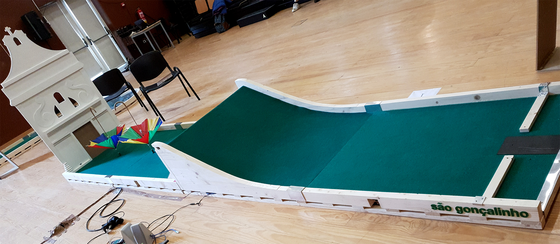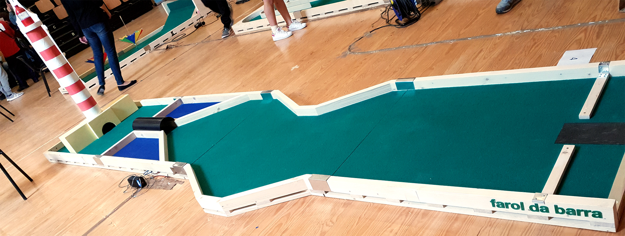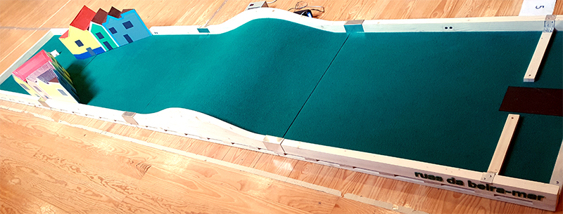 Gerades Gleis, mit Lomba in der Mitte des Hindernisses, erinnerte an die Brücken von Aveiro. Dann hat der Weg einen engen Durchgang, der von typischen Häusern gesäumt wird, die die Straßen und Wohnungen an der Küste symbolisieren.