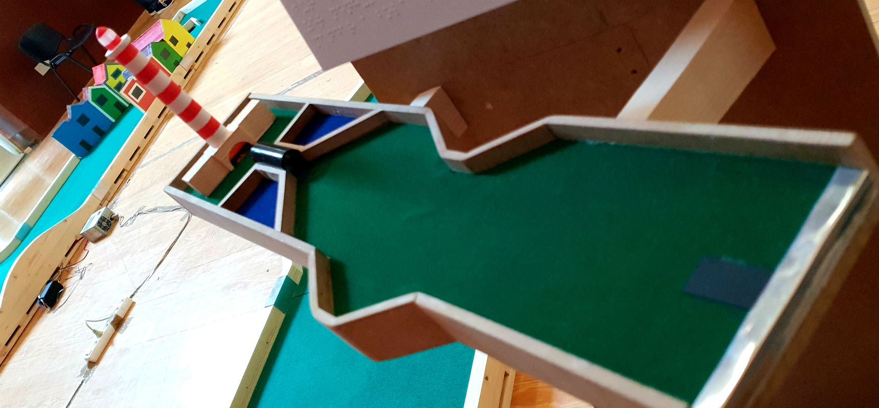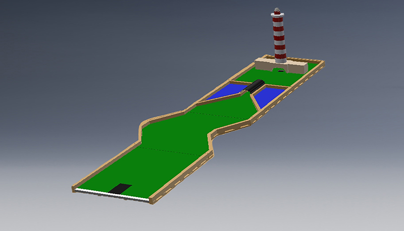 Später gibt es eine Verengung der Strecke mit einem Tunnel und dass bald das "Grün" mit dem Loch in dem der Ball treffen muss. Das Loch ist in die Tür des Leuchtturms eingefügt und ist das Ende der Spur.