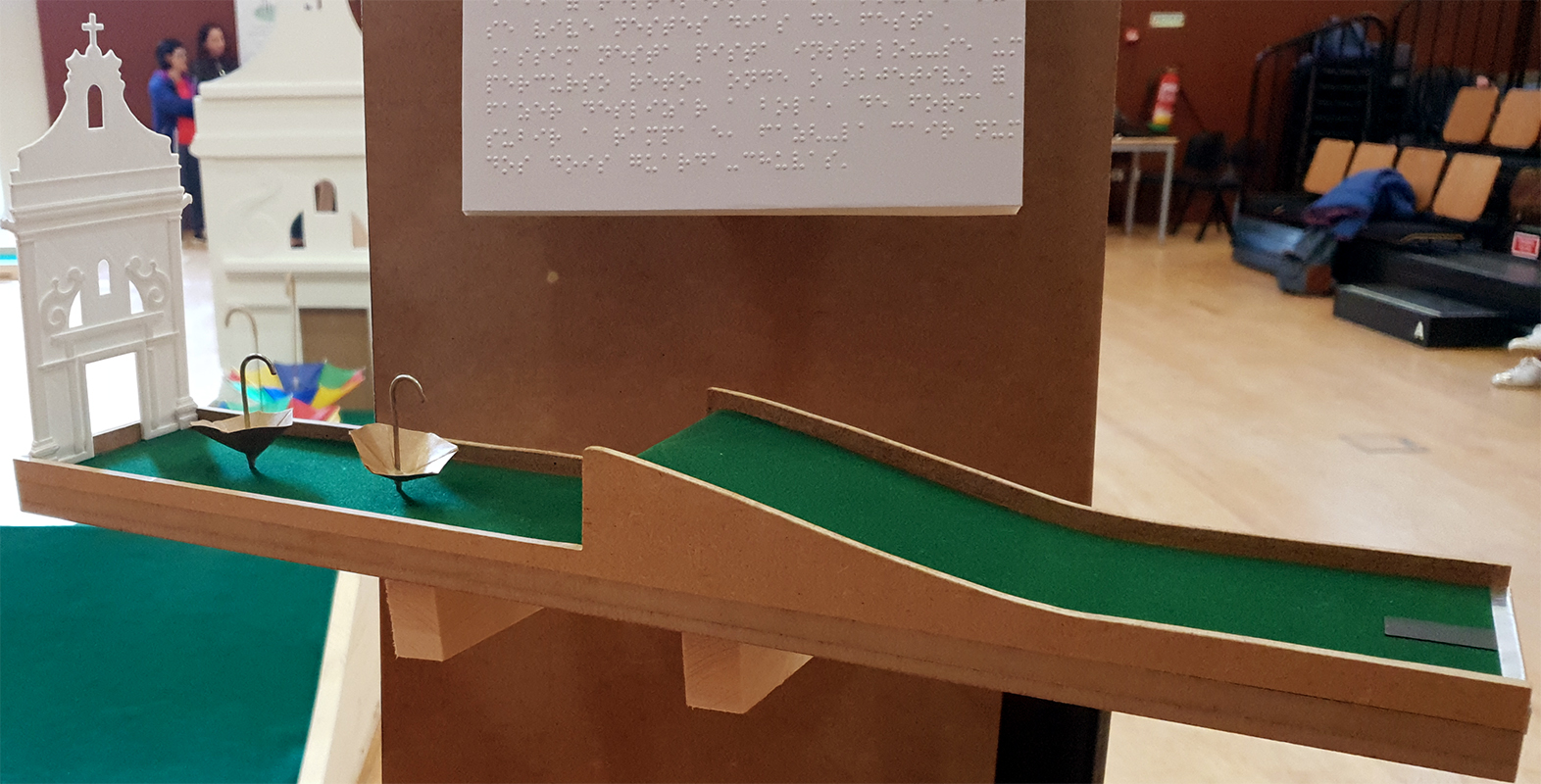Auf diese Weise wurde ein gerader Kurs installiert, bei dem das Ziel darin besteht, den Ball so zu schieben, dass er die Rampe erklimmt und sie auf einen der Schirme fallen lässt.
